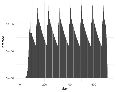 Results for a single state, show the cycles of infection, and the usage of available critical care beds.