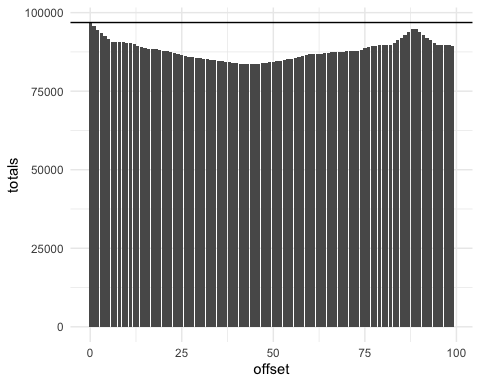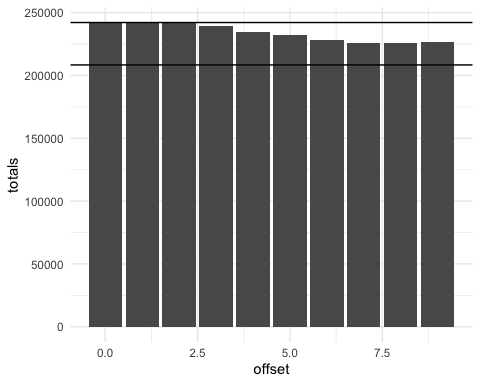 The line shows the lives lost without sharing. Below the line we see the lives lost when there is sharing. The lives saved varies based on how much later the pandemics started (the offset).